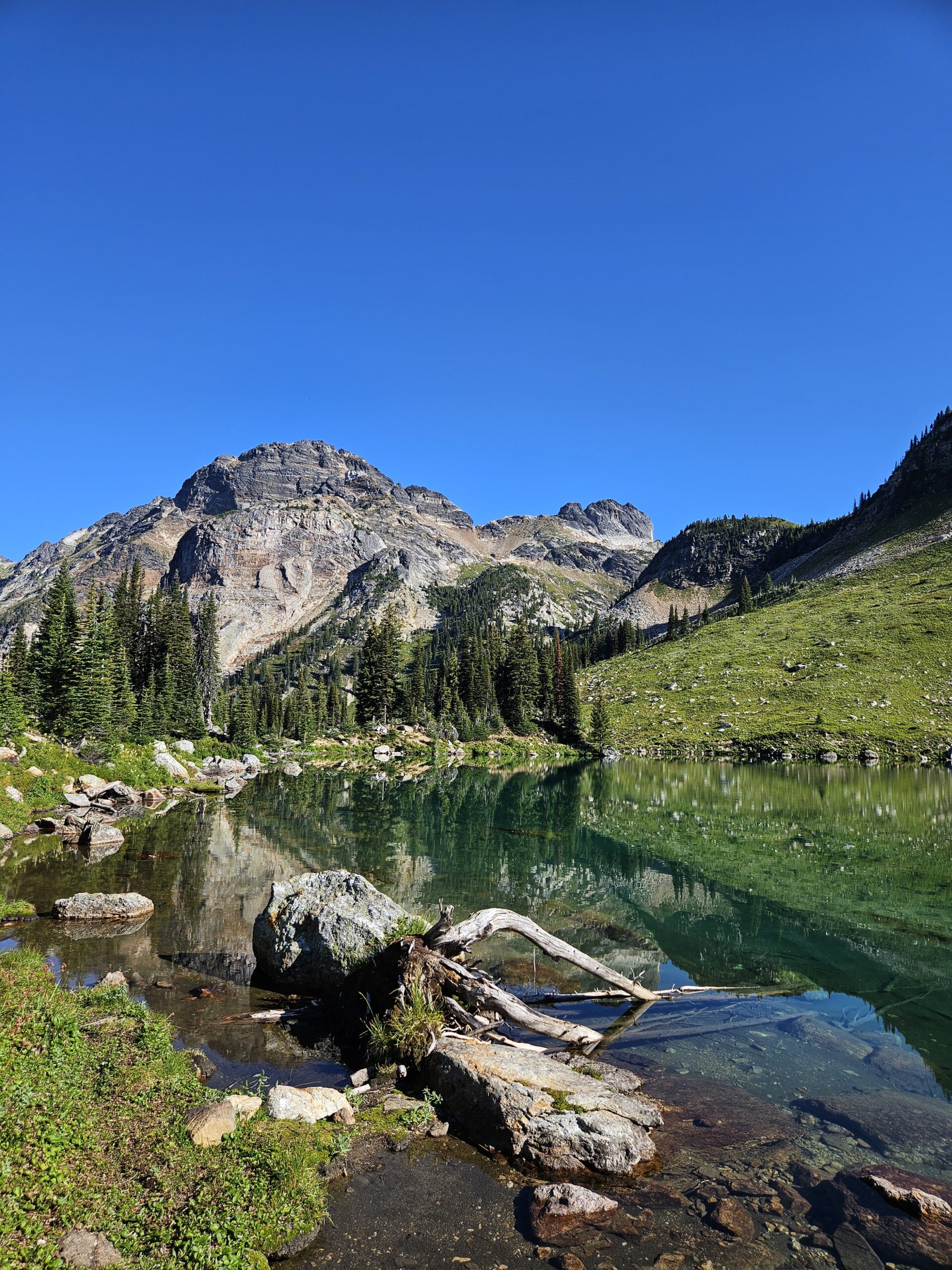 After this forested stretch, the trail climbs steeply, gaining nearly 500 m over just 1.5 km. The route leads up an avalanche chute and across the side of Mount Severide before reaching Monashee Lake. The climb is a grind, but the views are rewarding the entire way. Monashee Lake itself is small but striking. Its deep blue colour stands out dramatically against the surrounding peaks. A few makeshift campsites dot the west shore, but there are no facilities so make sure to bring proper food storage and pooping equipment.