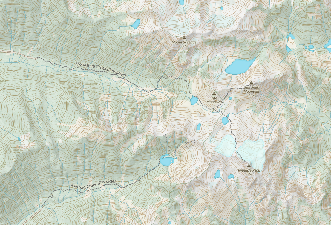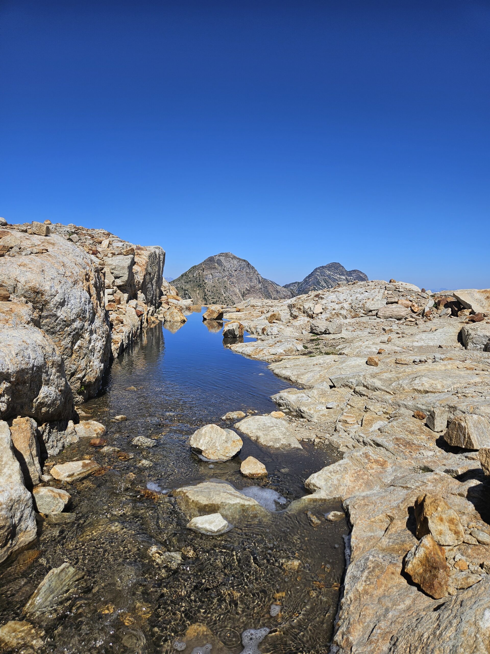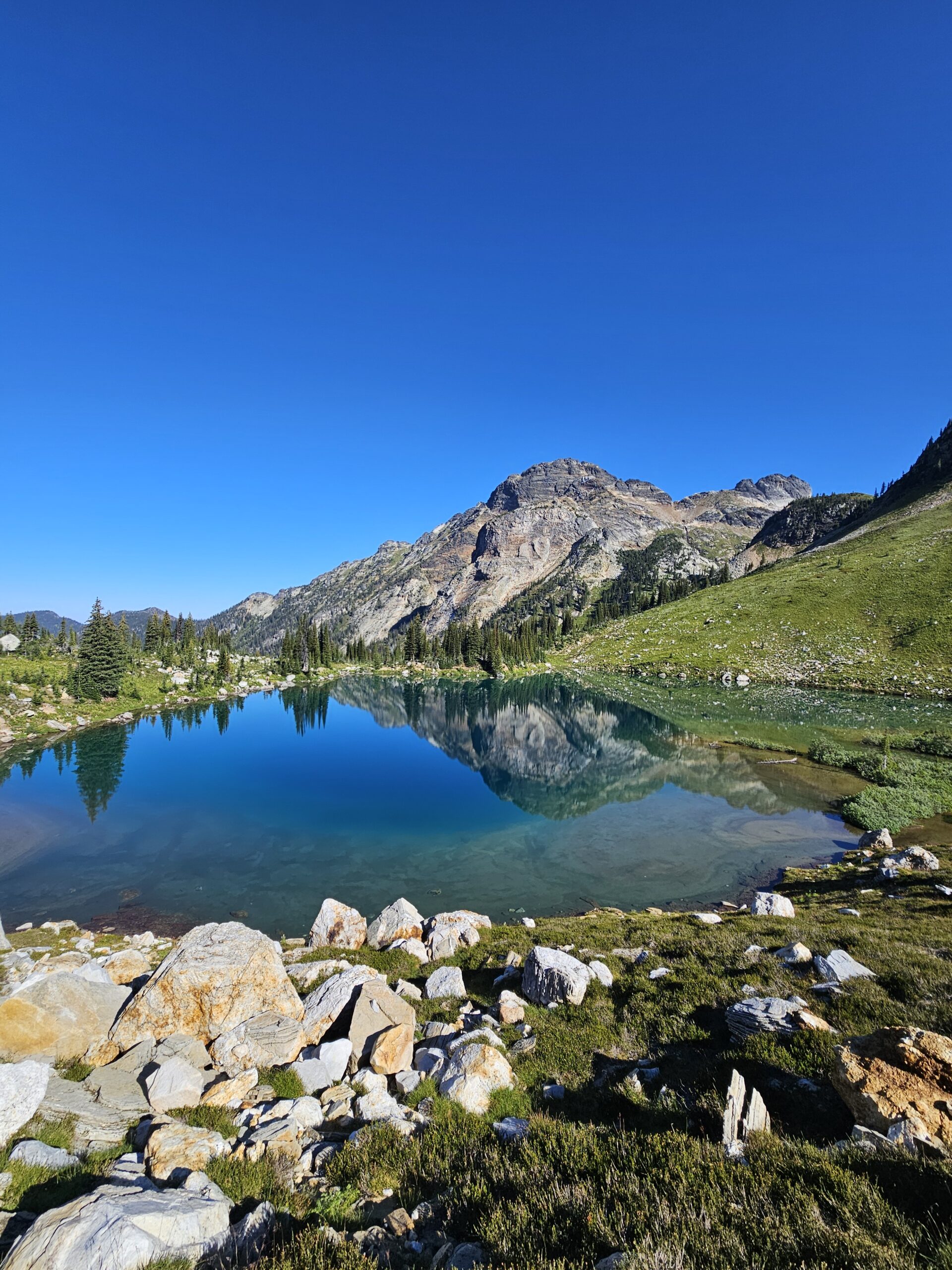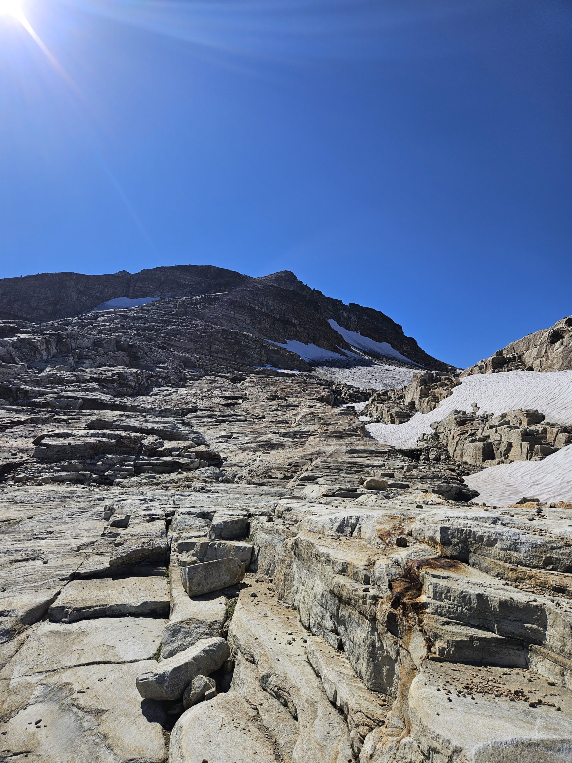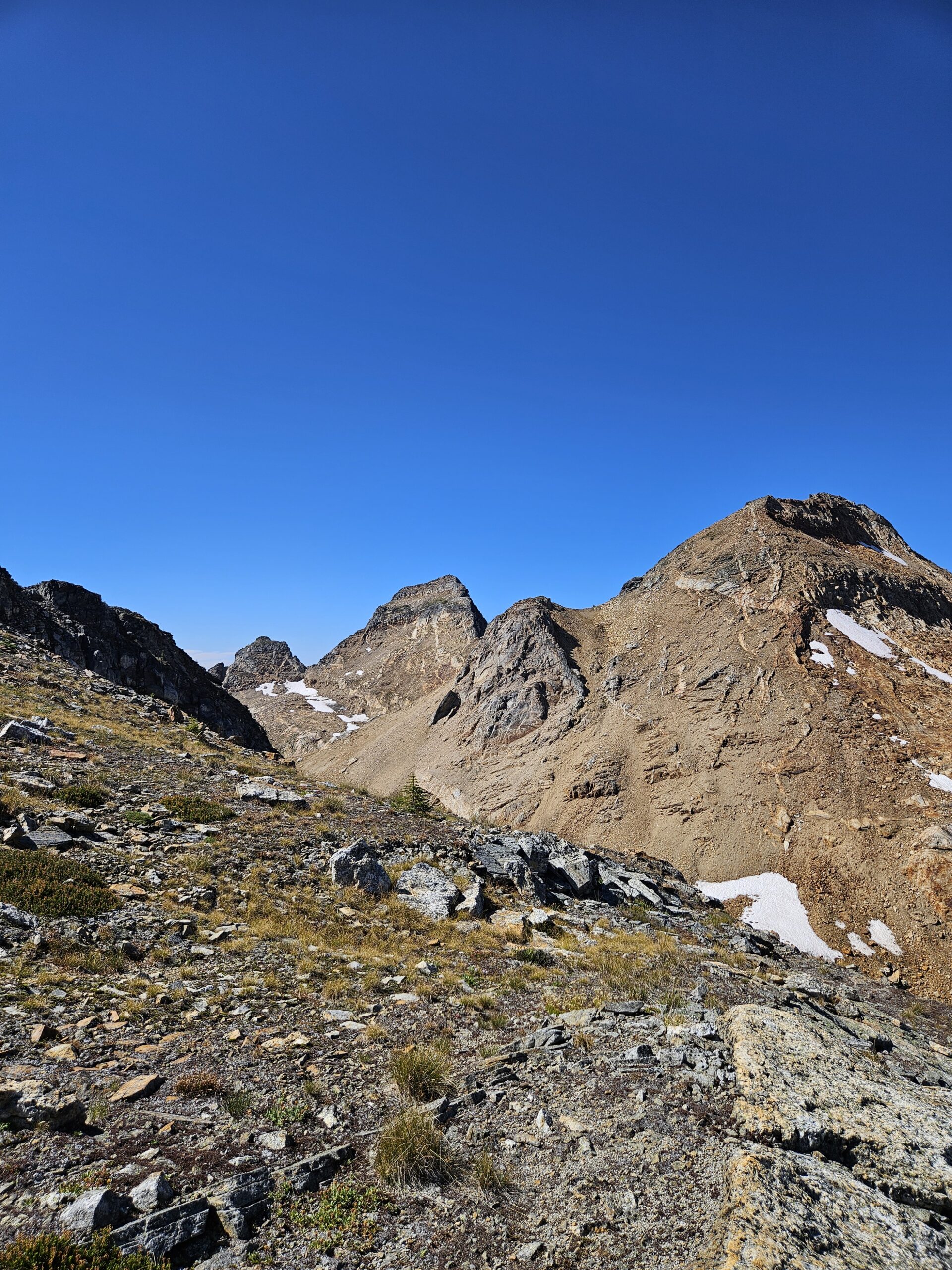 From the lake, the official trail ends, though the path worn by other hikers is easy to follow. From here you can head toward Mount Severide, Sun Peak Mountain, or Pinnacle Peak. AllTrails lists Sun Mountain and includes a line for the Pinnacle scramble, though without a dedicated trail entry. Gaia GPS shows both, and I used it to keep myself on track. Cairns also mark much of the route, and since the rocky terrain is wide open, you can usually pick your own way without much difficulty.