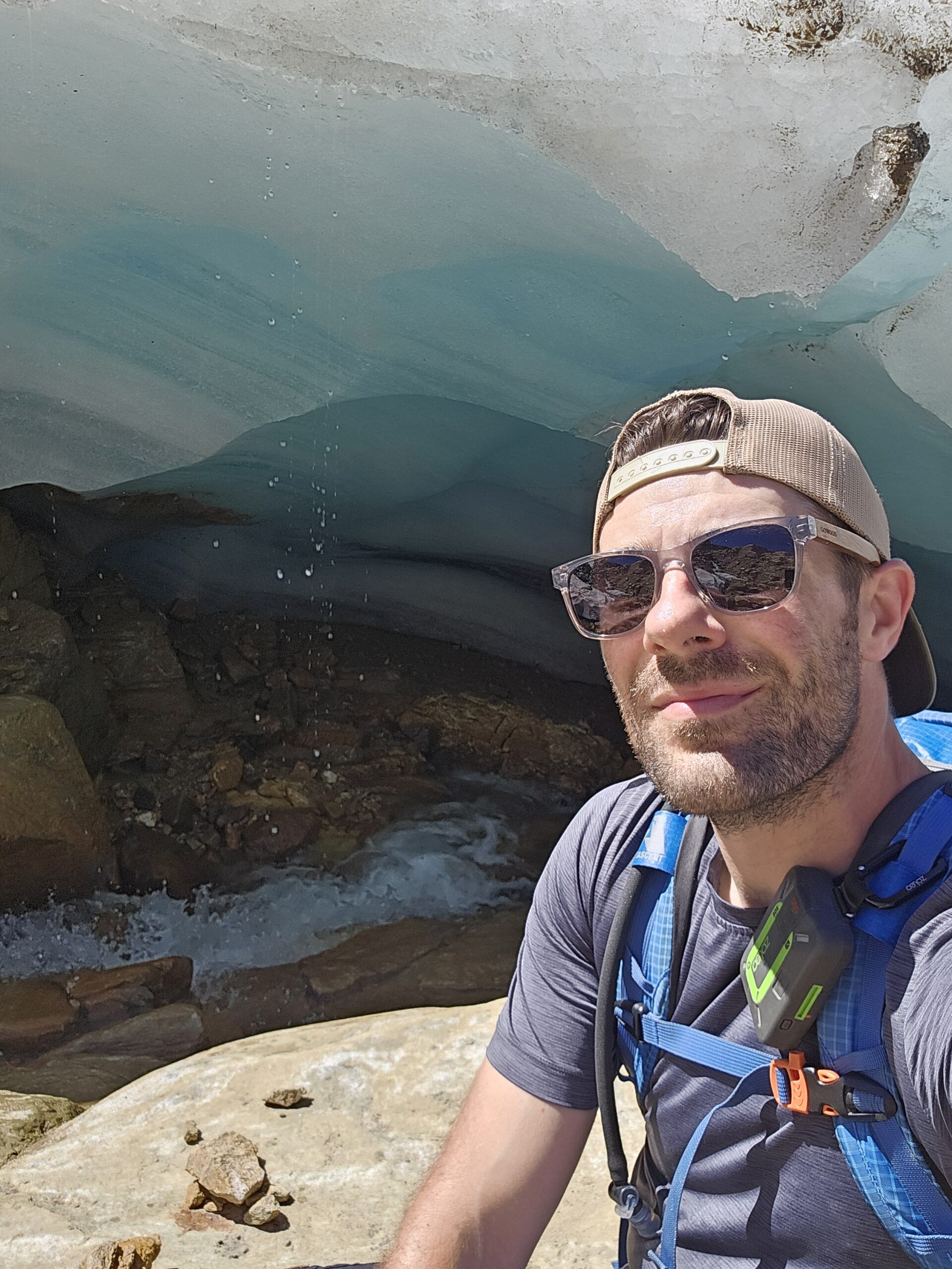 Back on solid ground, I retraced my steps toward the lake, stopping to explore small waterfalls and a mini ice cave formed from glacier melt. The footing can be loose in places, so care is needed, but the terrain is open and navigation straightforward. It took about an hour and a half to descend back to Monashee Lake, where I paused in the shade to escape the now intense heat. A swim would have been perfect, but it was already 3 p.m. and I still needed to hike out and drive to Kamloops, so I pressed on.