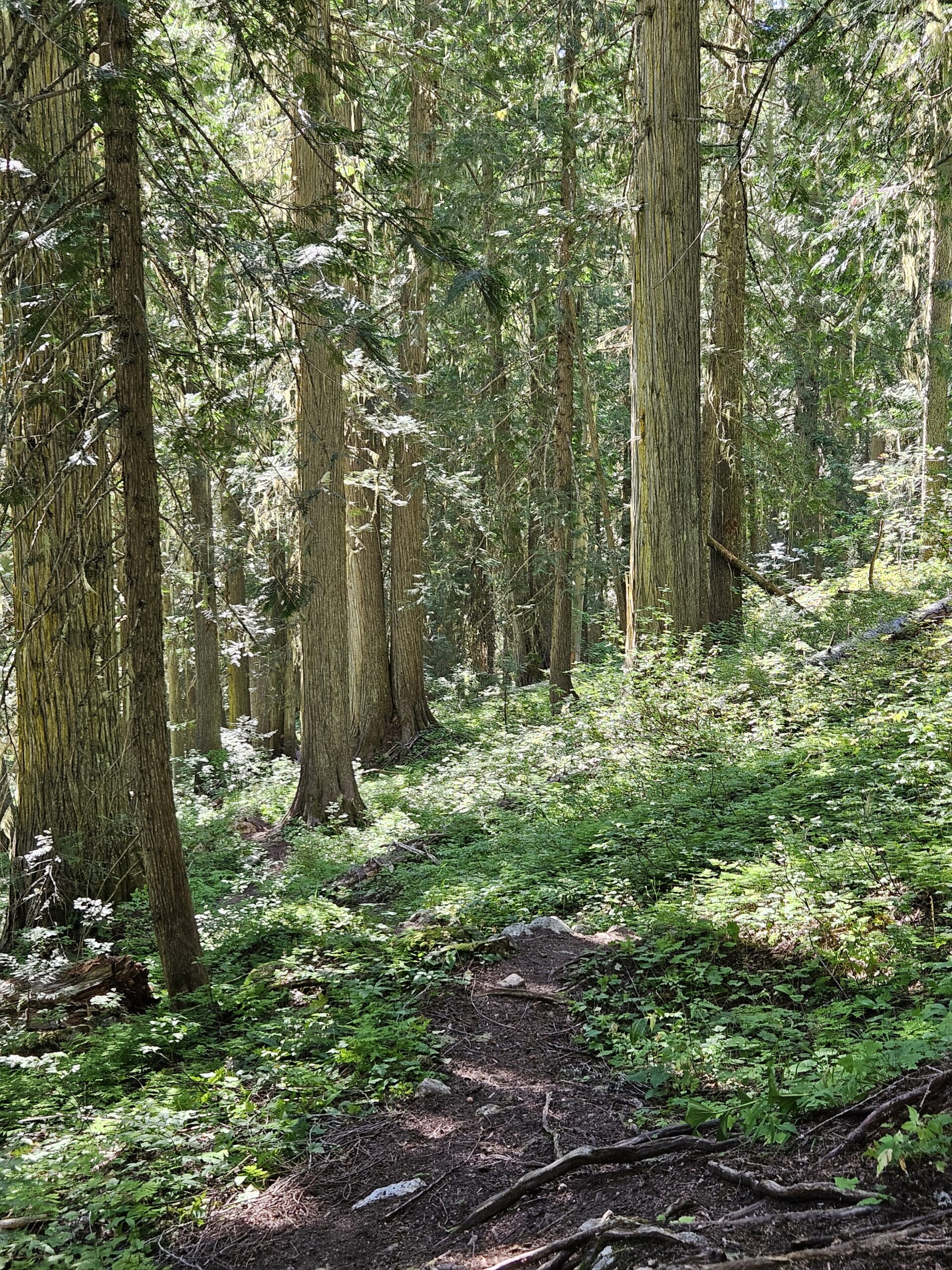 The trail begins at 1,340 m elevation. Essentials here include bear spray, mosquito repellent, and sunscreen, the latter of which I forgot, and I paid the price with a decent sunburn on my neck. The first three kilometers are fairly gentle, gaining only about 200 m, and pass through some stunning old-growth cedar with ferns carpeting the ground. The foliage in places is so thick it would be nearly impassable without the Vernon Outdoors Club’s (https://www.vernonoutdoorsclub.org/) hard work keeping the path clear. They’ve also marked the way thoroughly with flagging tape and orange (possibly red, my eyes couldn’t tell) diamonds, making navigation easy.