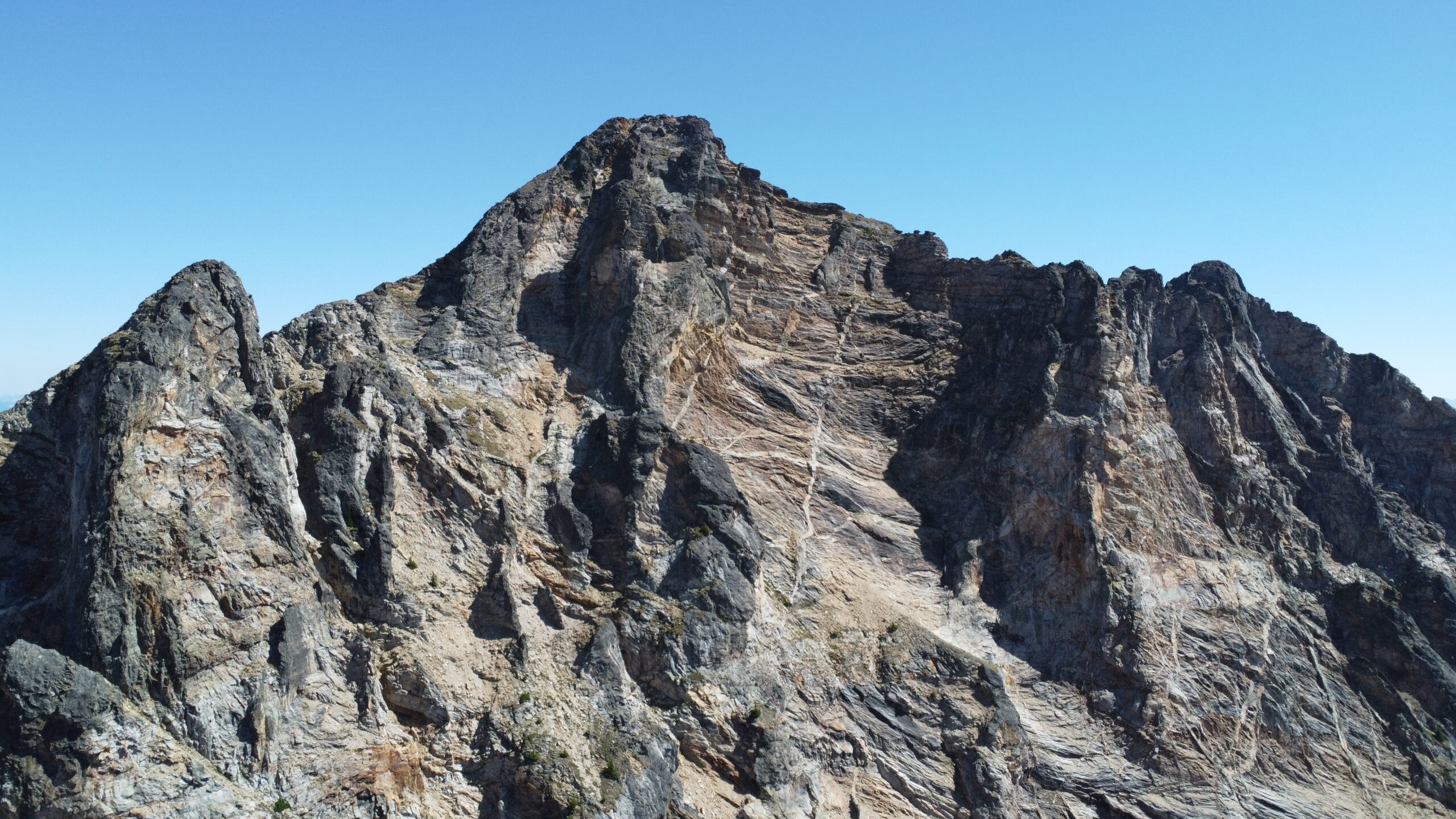 Nature really rolled out the red carpet for us hikers with this scramble. The rock forms natural steps nearly all the way up. It reminded me of the jagged stairs Gollum led Frodo and Sam up in Mordor, thankfully without the Shelob. From the saddle between South Pinnacle and Pinnacle Peak, the views stretch south across the valley and north to Mount Severide, Sun Peak Mountain, and, in the distance, Mount Odin. With no one else around, it was a perfect spot to practice flying my drone. I burned through two batteries, then had a bite to eat before pushing towards the summit.